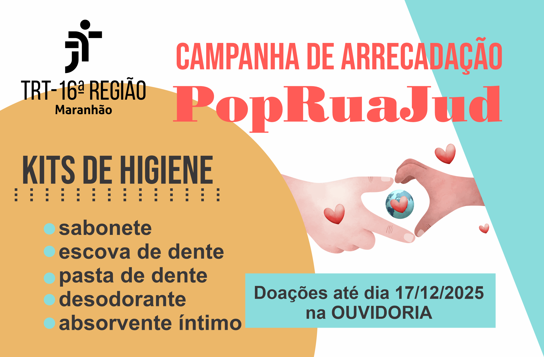 Iniciativa de relevância social, o Projeto de Atenção à População em Situação de Rua (PopRuaJud) conta com a adesão do Tribunal Regional do Trabalho da 16ª Região (Maranhão), que realiza a Campanha de Arrecadação de Kits de Higiene, a serem distribuídos às pessoas atendidas pelas ações do Projeto.