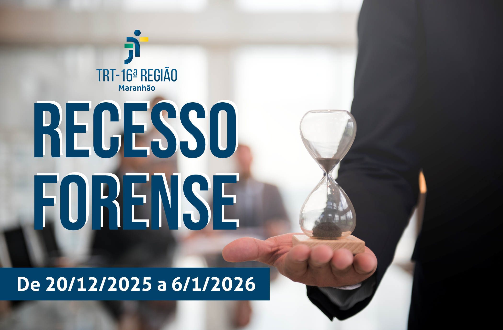 No Recesso, haverá trabalho presencial nos dias 22, 23, 26, 29 e 30 de dezembro de 2025, bem como nos dias 2, 5 e 6 de janeiro de 2026, em 25 unidades administrativas do TRT-16. O horário de funcionamento será das 13h às 17h30, na modalidade presencial, observando o disposto na Resolução Administrativa nº 203/2016, alterada pelas RAs nº 20/2017 e nº 262/2017.