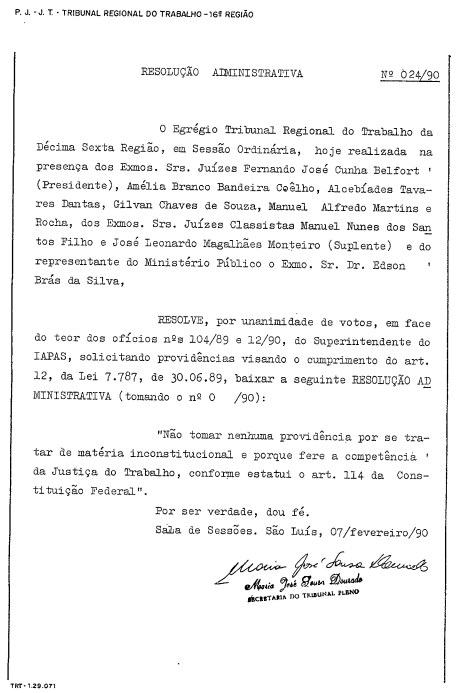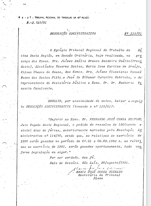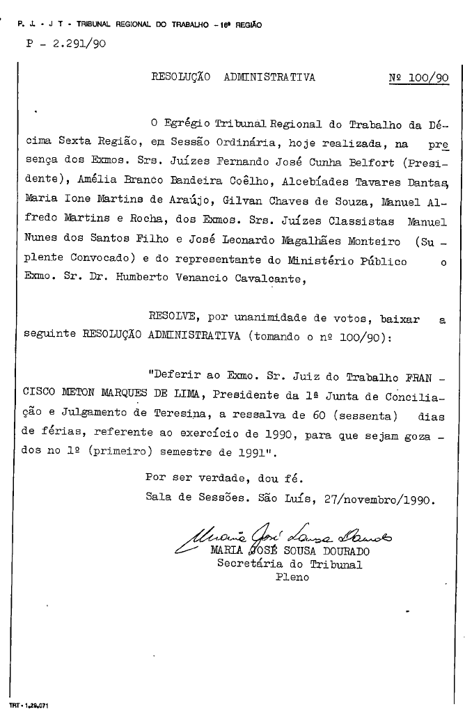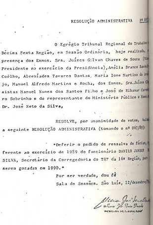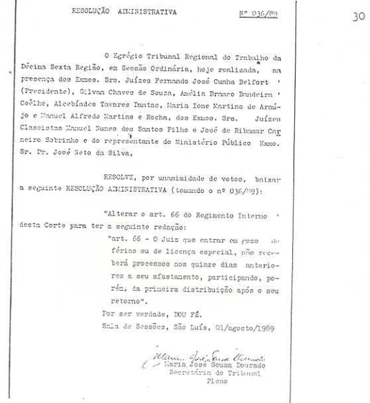 Esse registro histórico evidencia a formalidade, a organização e o caráter colegiado das decisões internas do TRT da 16ª Região, mostrando como eram conduzidos os debates e aprovações de normas que orientavam o funcionamento da Justiça do Trabalho no Maranhão à época.