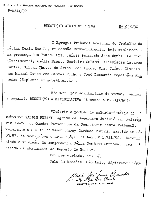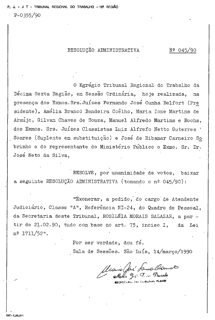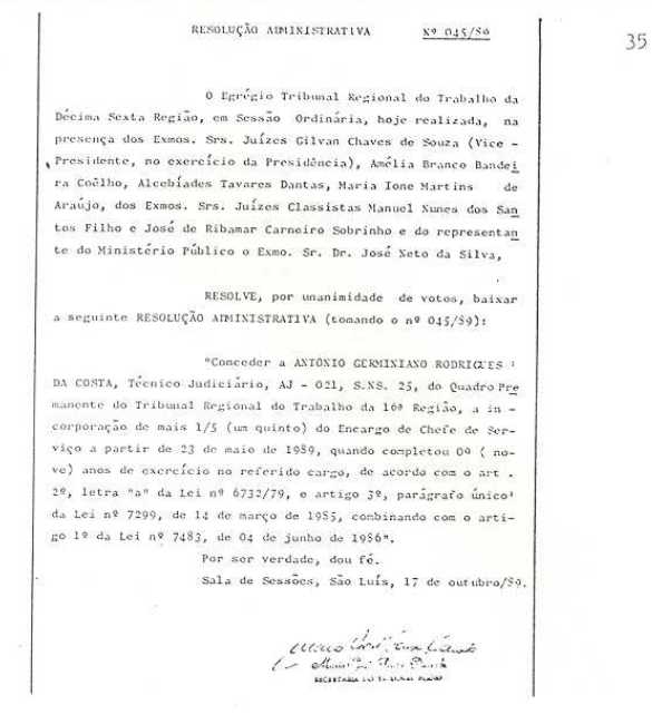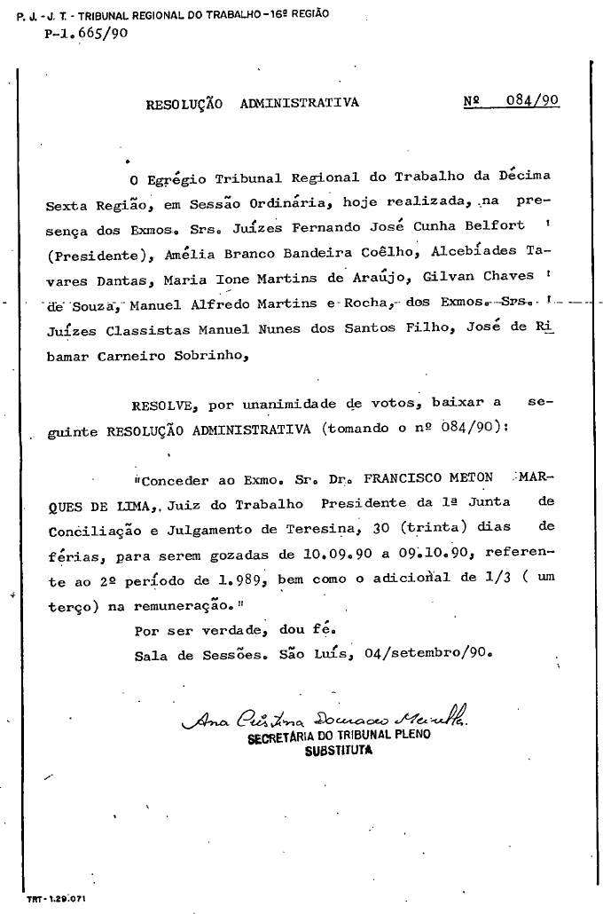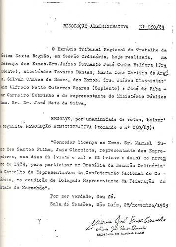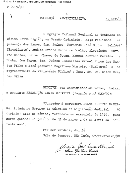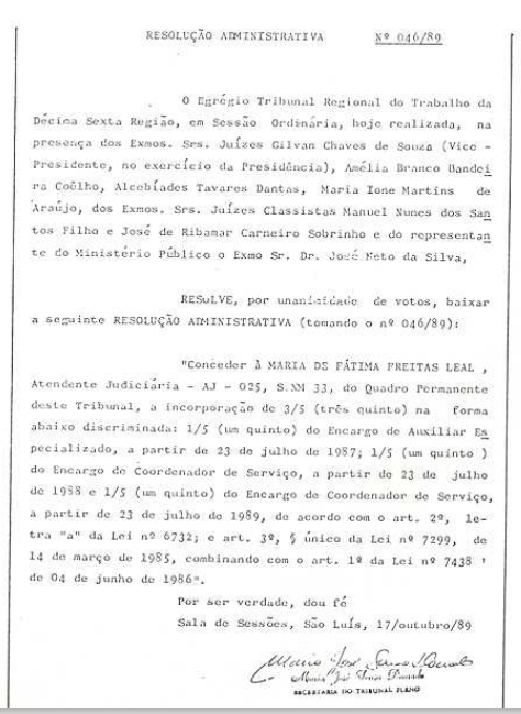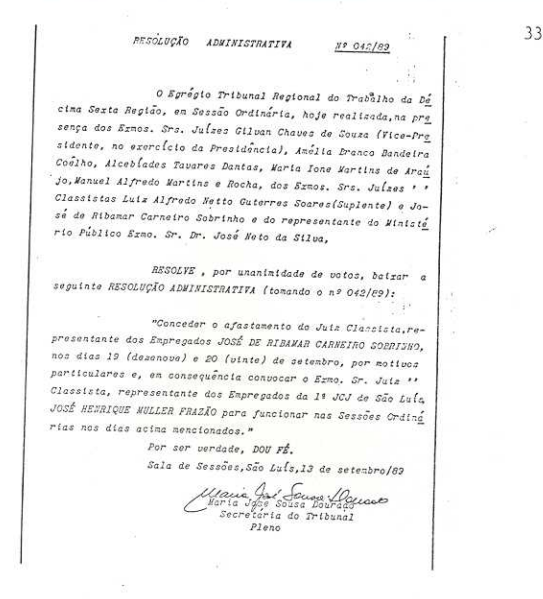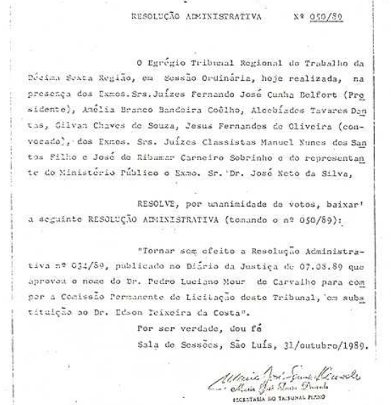 Aconteceu no dia 07 de Junho de 1989, às 14:20 horas . Estavam presentes os juízes Alcebíades Tavares Dantas, que presidiu a sessão, e mais Amélia Branco Bandeira Coelho, Fernando José Cunha Belfort, Gilvan Chaves de Souza, Manuel Alfredo Martins e Rocha, Maria Ione Martins de Araújo, bem como os juízes classistas Luis Alfredo Netto Guterres Soares (suplente), face a ausência do juiz Manuel Nunes dos Santos Filho e José de Ribamar Carneiro Sobrinho e o representante do Ministério Público, Dr. José Neto Silva.