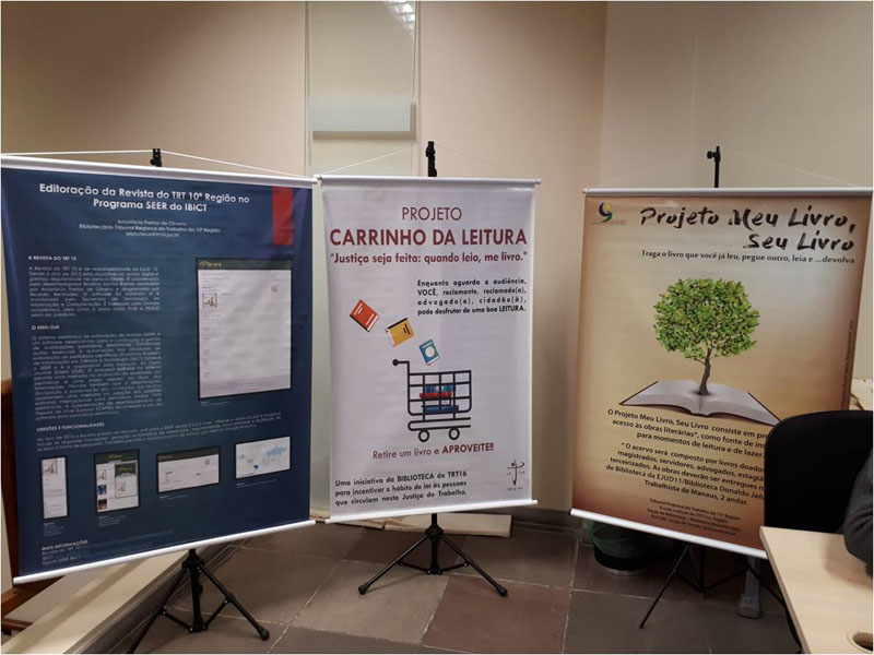 TRT-MA - o TRT do Maranhão deixou seu registro no evento ao participar de exposições com o banner do projeto "Carrinho de Leitura", iniciativa da Seção de Biblioteca e Gestão Documental, lançado em março deste ano, pelo presidente do Tribunal, desembargador James Magno Araújo Farias, no Forum Astolfo Serra. A Seção de Biblioteca deixa à disposição dos interessados, nos corredores do Fórum, diversos livros de literatura, em geral, e publicações do TRT-MA. A ideia é estimular o hábito da leitura entre os litigantes, advogados e demais pessoas que circulam pelas Varas do Trabalho de São Luís.