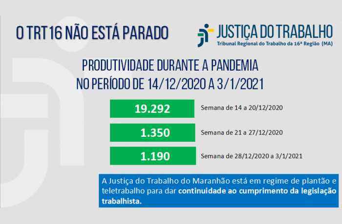 Produtividade acumulada no período de 13.3.2020 a 3.1.2021: 27.795 sentenças; 42.458 decisões; 12.141 acórdãos; 133.710 despachos; 12.595 alvarás; 12.839 processos baixados na fase de execução; 7.853 penhoras online; e 523.336 documentos juntados aos autos por servidores.