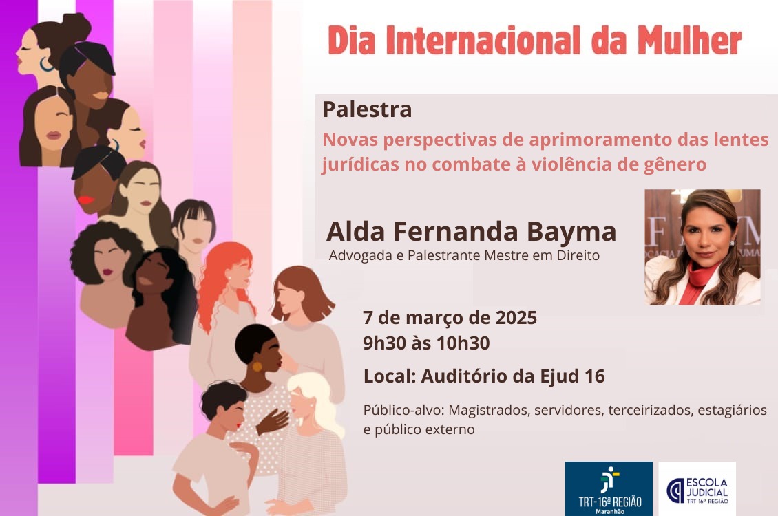 No mês em que se celebra o Dia Internacional da Mulher, o Tribunal Regional do Trabalho da 16ª Região reafirma seu compromisso com a promoção da igualdade e o combate à violência de gênero. Como parte das ações de conscientização, a Escola Judicial (EJUD16) realizará, no dia 7 de março de 2025, às 9h30, a palestra "Novas Perspectivas de Aprimoramento das Lentes Jurídicas no Combate à Violência de Gênero", ministrada pela advogada Alda Fernanda Bayma.
