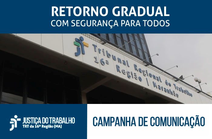 O Tribunal Regional do Trabalho da 16ª Região (Maranhão), por meio do Setor de Comunicação Social, vem realizando campanha de conscientização e disseminação de informações intitulada “Retorno Gradual com Segurança para Todos”. A campanha é composta por uma série de matérias e peças publicitárias, a fim de manter os públicos interno e externo informados acerca dos itens do Plano de Ação para retomada gradual das atividades presenciais, aprovado pelos dirigentes do TRT-MA, desembargadores Américo Bedê Freire (presidente) e José Evandro de Souza (vice-presidente e corregedor), conforme Ato Conjunto GP e GVP/CR Nº 06/2020, de 13 de agosto de 2020.
