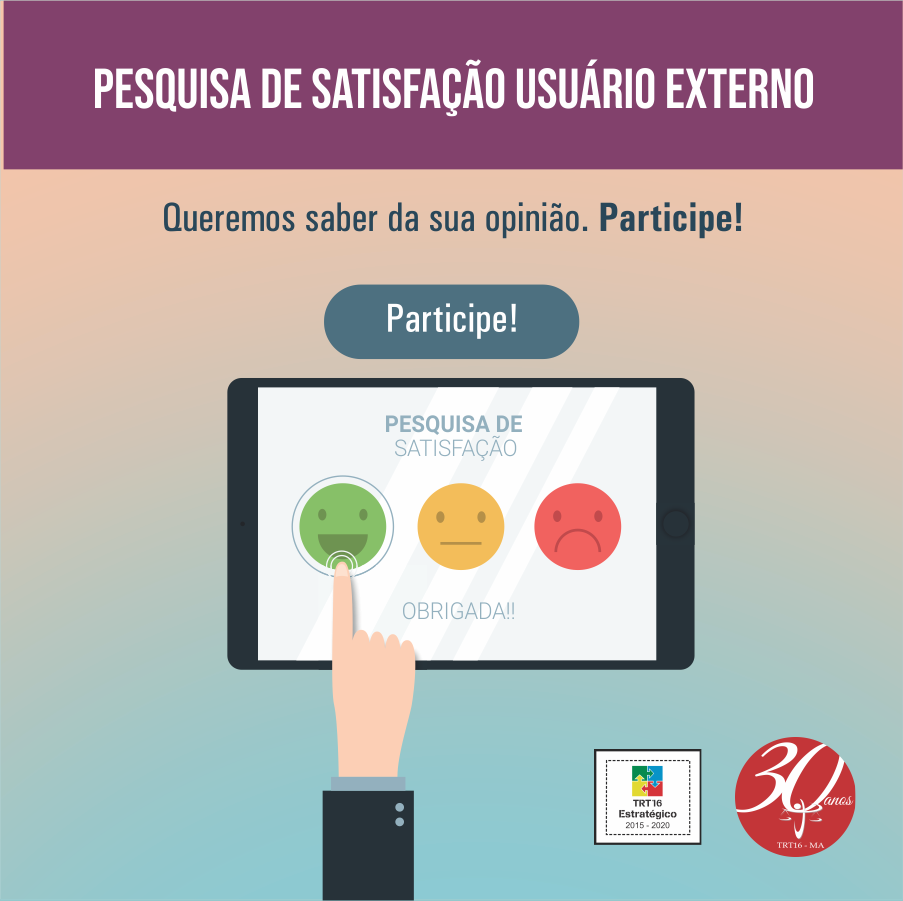 Público externo – Ao responder a Pesquisa de Satisfação, o usuário externo contribui para a melhoria da Justiça do Trabalho no Maranhão, pois será avaliada a qualidade dos serviços prestados na busca de solução nos conflitos trabalhistas. A pesquisa leva apenas alguns minutos, o participante não precisa se identificar e suas respostas são confidenciais, sendo utilizadas apenas para fins estatísticos.